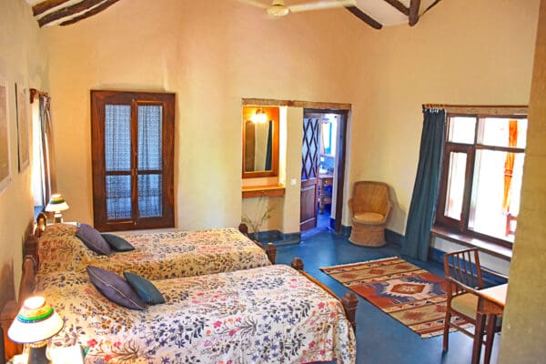 Designed by Eugene Pandala, an Indian architect known for earthy and ecologically sustainable designs, the cottage walls are made from mud and the roofs are thatched with dry grass. This offers the best natural insulation from the extreme outside temperatures. The interiors are earthy yet luxurious, a fantastic blend for travellers to experience a rural Indian household setting in the lap of luxury.